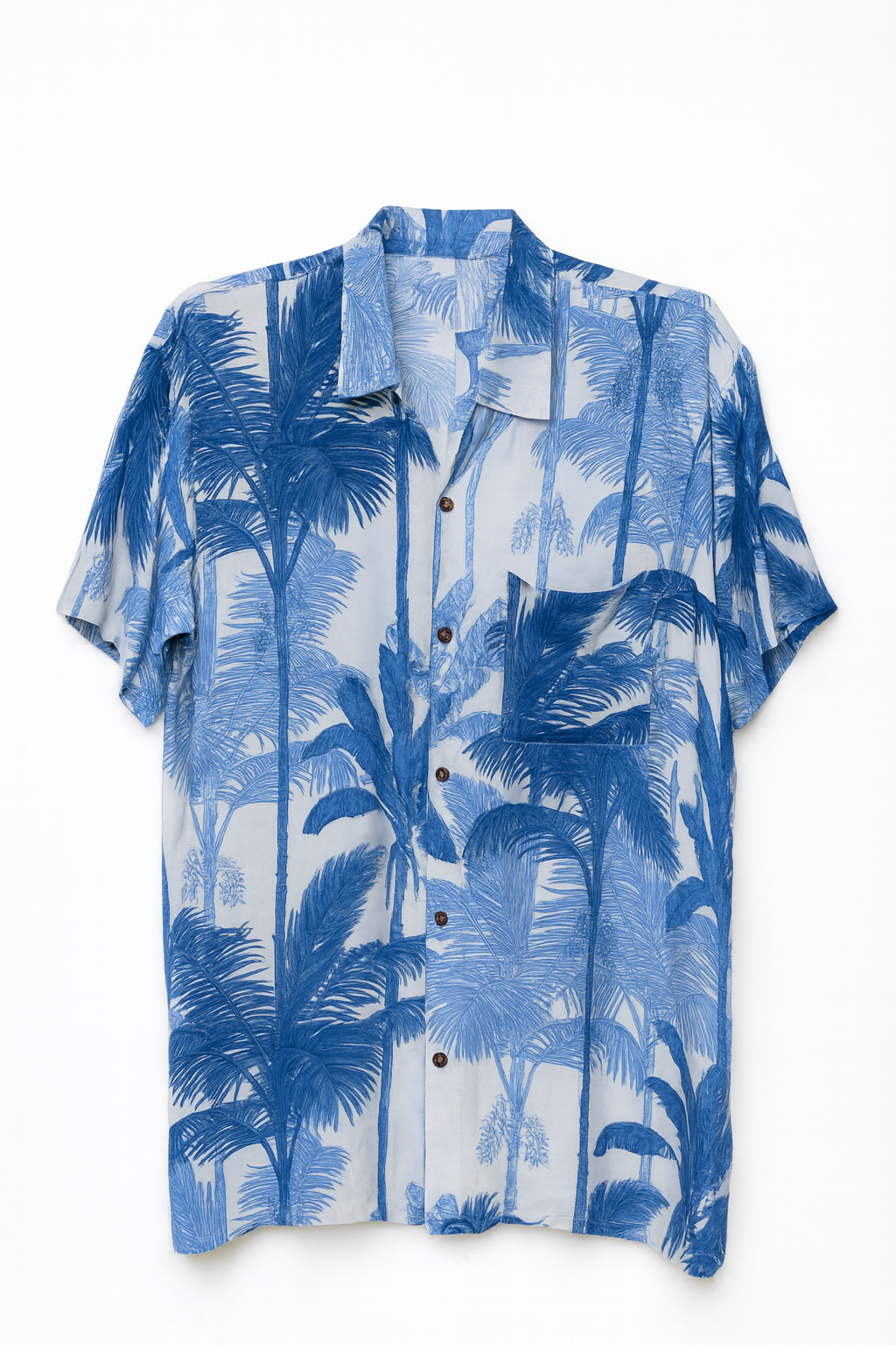 A tropical-themed shirt featuring detailed blue palm tree illustrations on a light background. Soft, flowy fabric and a loose silhouette make it perfect for sunny days and relaxed adventures.