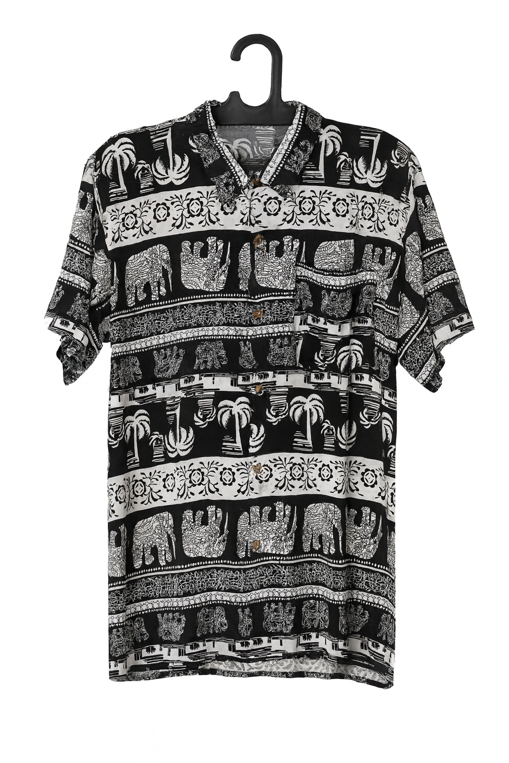 A stylish black-and-white beach shirt with bold elephant and palm-tree motifs. The intricate print adds a unique cultural touch, while the lightweight material keeps it comfortable and airy. With its relaxed silhouette and easy button-down front, this shirt is perfect for holidays, beach days, or laid-back casual looks.