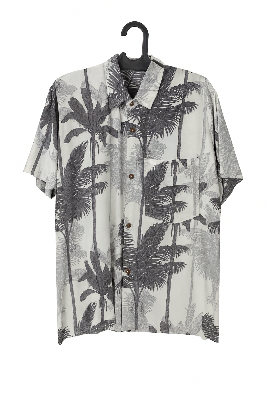 A lightweight beach shirt featuring a soft gray base with detailed palm-tree illustrations. Designed for comfort and breathability, this shirt offers a relaxed fit perfect for tropical weather. The natural fabric texture and clean button-down style make it ideal for casual outings, vacations, or everyday summer wear.