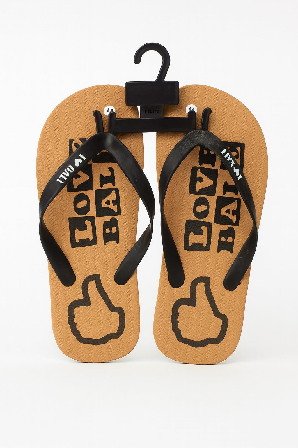 A casual and stylish pair of beach flip-flops featuring a textured brown footbed with bold LOVE BALI graphics and playful thumbs-up icons. Designed with durable black straps for everyday comfort.